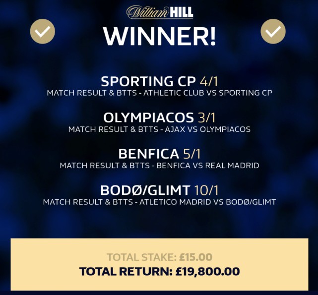 Så manglede kun Sporting. De var bagud i Bilbao, men fik bragt sig på 2-2 undervejs. Først i fjerde minut af tillægstiden faldt sejrsmålet til 3-2. Til total ekstase blandt Sporting-spillere og stab. Og – skal vi gætte – hos en William Hill-kunde.