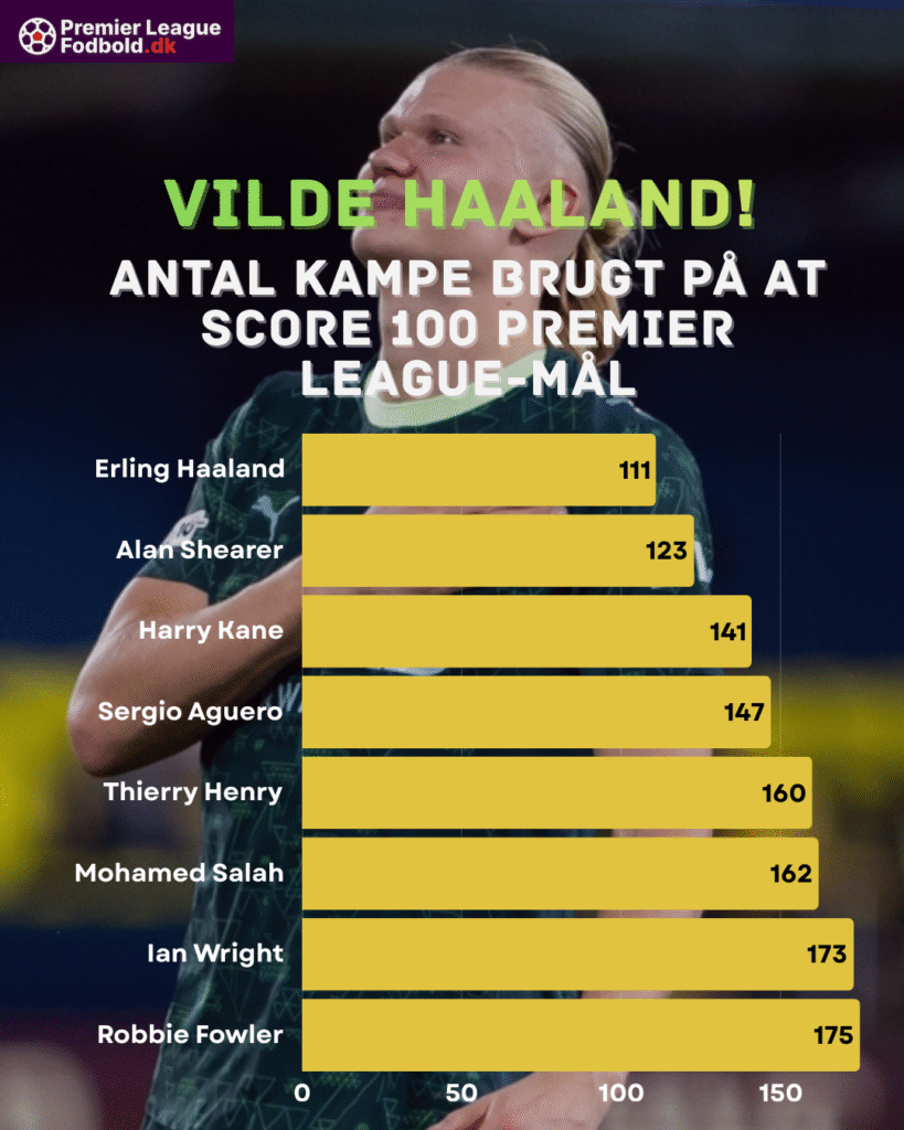 Sølle 111 kampe skulle Haaland bruge på at gå fra nul til 100 Premier League-kasser.