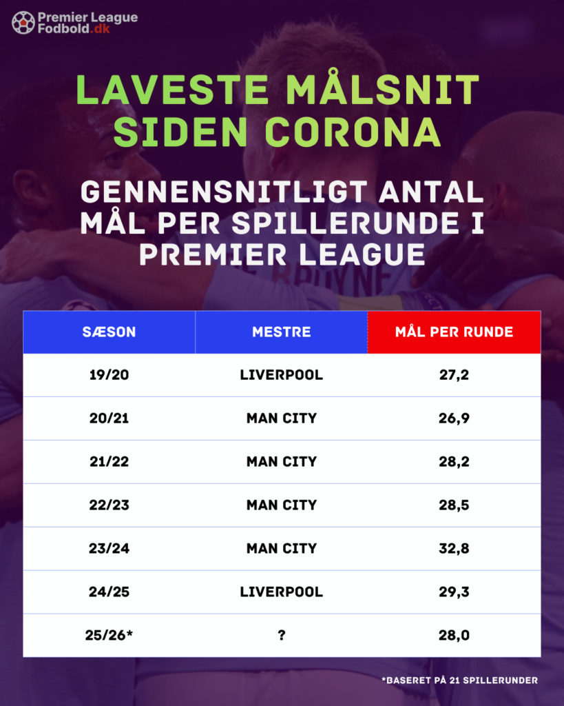 Dermed har 25/26-sæsonen kurs mod det laveste målsnit siden tiden med Covid-19, hvor den manglende støtte fra lægterne givetvis lagde en dæmper på målscoringen.