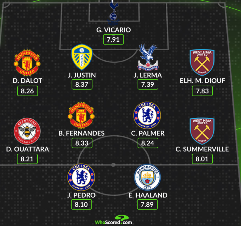 Bruno Fernandes var igen den afgørende faktor, da Manchester United slog Tottenham 2–0 og leverede en ægte anførerpræstation. Midtbanedynamoen var omdrejningspunktet for Uniteds spil og havde en central rolle i åbningsmålet efter en indstuderet dødbold, inden han selv satte det sidste punktum i det 81. minut. Hans 200. direkte målinvolvering for klubben, fordelt på imponerende 104 mål og 86 assists i 314 kampe. Udover scoringen styrede Fernandes tempoet efter Tottenhams røde kort. Hans betydning for Uniteds optur under Carrick kan næppe overvurderes, og sejren holdt dem på fjerdepladsen, blot tre point fra andenpladsen.