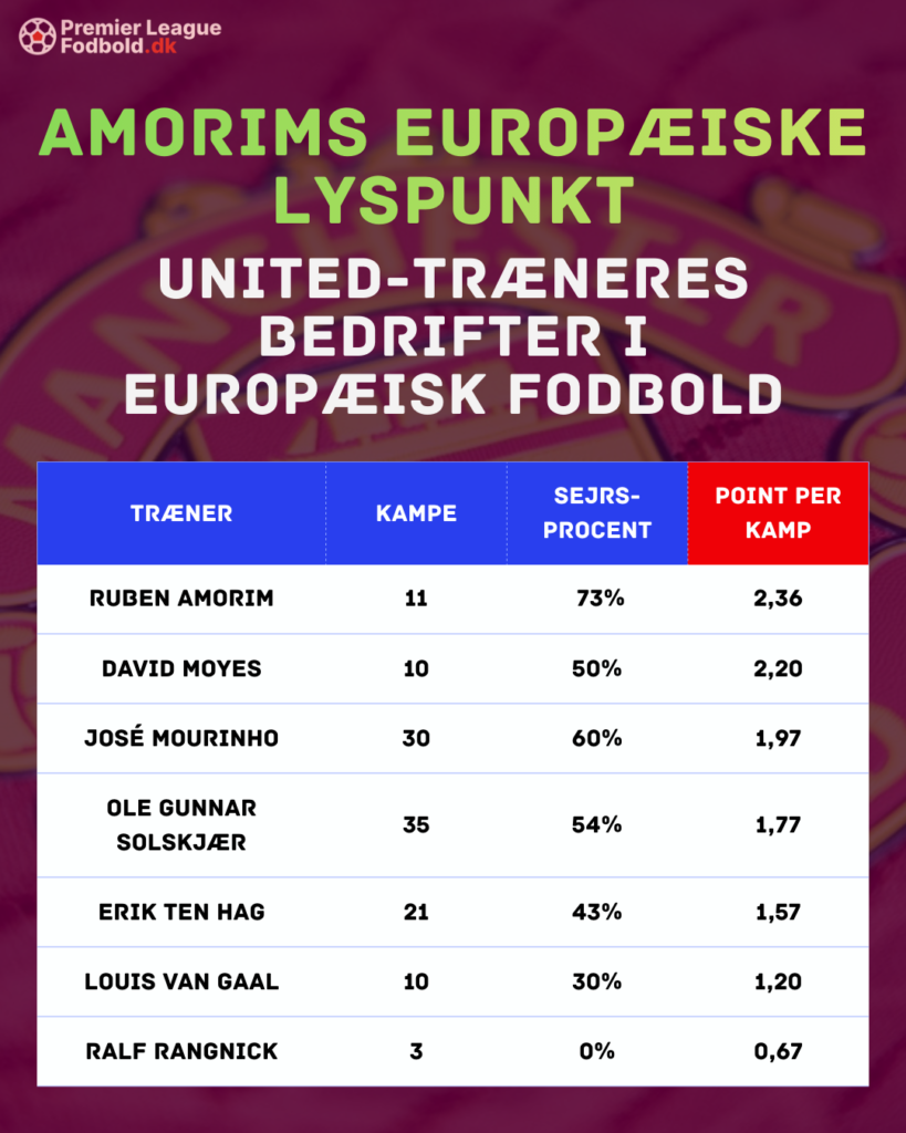 Det giver en sejrsprocent på hele 73% og et imponerende pointsnit på 2,36 i europæiske turneringer, hvilket er klart bedst blandt alle nyere United-managere.